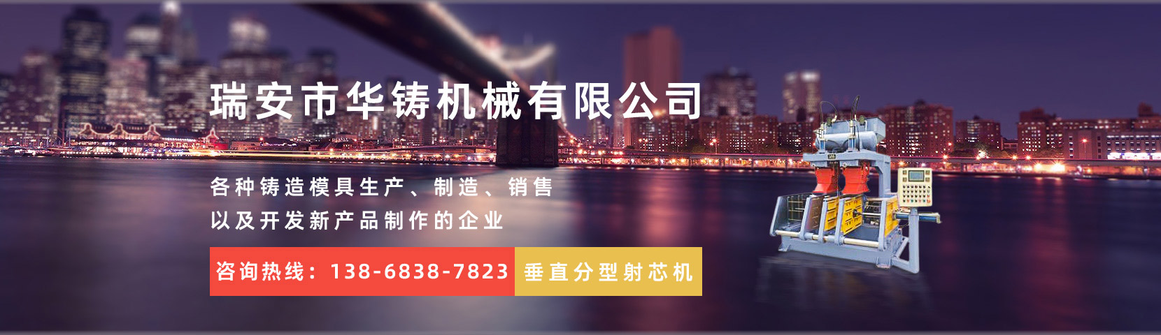 瑞安市華鑄機械有限公司,創(chuàng)建于2014年,位于經(jīng)濟發(fā)達的機械制造基地——溫州。本公司是一家致力于全自動重力澆鑄機、射芯機殼芯機、覆膜砂設(shè)備、各種鑄造模具生產(chǎn)、制造、銷售以及開發(fā)新產(chǎn)品制作的企業(yè)。